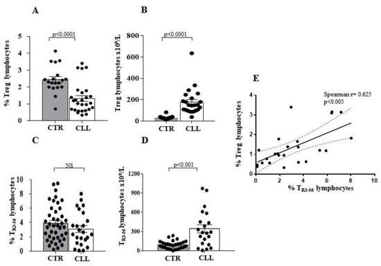 To describe the T-cell profile of our CLL cohort, we analysed the percentage of Treg and TR3-56 subset in the T-cell population. In this regard, an increased percentage of Tregs (13.81 ± 1.07 vs. 7.68 ± 0.53 in healthy controls; p < 0.0001) and TR3-56 (15.48 ± 2.34 vs. 6.01 ± 0.63 in healthy controls; p < 0.0001) was observed in the T-cell subset from CLL subjects (Figure 3A,B, respectively).