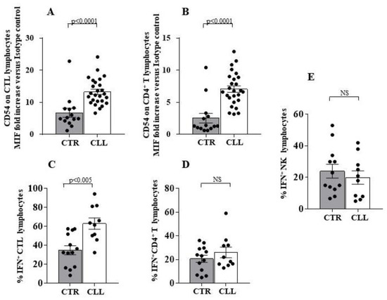 An increased expression of CD54 (13.26 ± 0.80 vs. 6.72 ± 1.39 in healthy controls; p < 0.0001) and a higher IFN-γ production (62.94 ± 5.97 vs. 34.84± 4.81 in healthy controls; p < 0.005) by CTL characterise CLL subjects (Figure 4A,C, respectively).