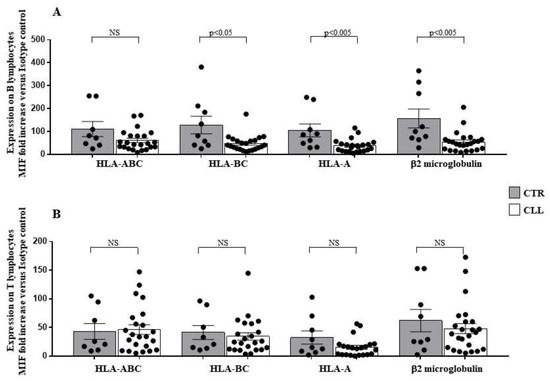 To evaluate the expression of HLA-I molecules, we used specific monoclonal antibodies (mAbs) able to recognise specific HLA-I molecular structures [58,59,60,61,62] (see Materials and Methods section). Analysis of HLA-I expression on circulating B lymphocytes of CLL subjects with stable disease revealed a significant reduction in HLA-A (37.49 ± 5.77 vs. 104.9 ± 27.81 in healthy controls; p < 0.005), HLA-BC (47.58 ± 7.25 vs. 128.4 ± 38.57 in controls; p < 0.05) and β2-microglobulin surface level (54.29 ± 8.96 vs. 156.81 ± 41.91 in healthy controls; p < 0.005) (Figure 5A). The expression of the HLA-ABC molecules, evaluated as a whole, on the membrane of the leukaemia B-cell clones was not significantly different from the B lymphocytes of the control population (61.32 ± 9.31 vs. 110.7 ± 32.78 in healthy controls) (Figure 5A). At variance, HLA-I expression on T lymphocytes showed no significant difference between CLL subjects and healthy controls (Figure 5B).