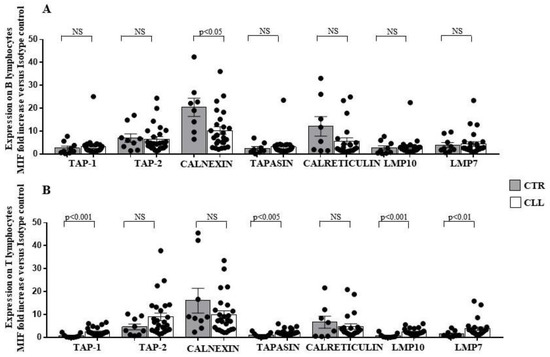 Significant decrease in intracellular calnexin expression in B lymphocytes, associated with up-regulation of TAP-1, Tapasin, LMP7 and LMP10 in the T-cell compartment, characterises CLL subjects with stable disease. Panel (A,B) show TAP-1, TAP-2, calnexin, tapasin, calreticulin, LMP10 and LMP7 intracellular expression in B- and T-cell compartment, as indicated. As shown, significant decrease in intracellular calnexin has been observed in the B cells of the CLL subjects, as compared with controls; at variance significant increase in TAP-1, Tapasin, LMP10 and LMP7 was revealed in the T lymphocytes of the CLL cohort. As detailed in the Materials and Methods Section, intracellular immune-fluorescence data were expressed as ratio of the mean intensity fluorescence (MIF) value for B and T cells and the control MIF value obtained after staining the same cell populations with the isotype control mAb. Grey and white columns indicate data obtained in healthy controls (CTR caption of (A,B) Panels) and CLL individuals (CLL caption of (A,B) Panels), respectively. Statistical evaluation of data has been performed by means of the Mann–Whitney test. Statistical significance values are indicated. NS indicates the not statistically significant value. The applied flow cytometry gating strategy is reported in Section 4.2.
