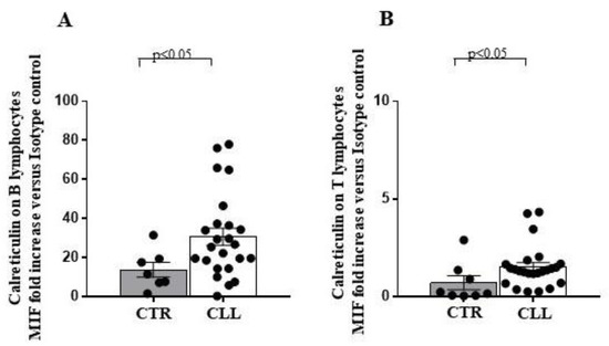 Extracellular expression of calreticulin represents a marker of endoplasmic reticulum (ER) stress, usually associated with intracellular protein misfolding and immunogenic cell death processes [63]. The extracellular calreticulin expression increased in both circulating B (30.67 ± 4.40 vs. 13.74 ± 3.76 in healthy controls) and T lymphocytes (1.5 ± 0.22 vs. 0.71 ± 0.35 in healthy controls) of the CLL subjects (Figure 7).
