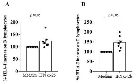In addition, the binding of the specific anti HLA-ABC mAb revealed an increase in HLA-I surface expression when B cells and T cells from CLL subjects were cultured with IFN α-2b (Figure 8A,B). This finding suggests that the defective expression of HLA-I molecules in CLL B cell clones might be susceptible to cytokine-mediated in vitro restoration.