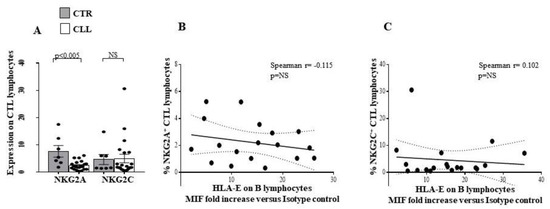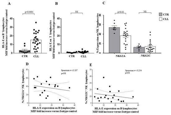 Altered HLA-E molecule expression by B lymphocytes has been described in CLL [73,74]. Our data confirm such observation in CLL circulating B cells (15.24 ± 1.80 vs. 3.31 ± 1.27 in healthy controls), while no significant difference was revealed in the HLA-E expression by T cells of the CLL subjects with respect to controls (1.36 ± 0.19 vs. 0.79 ± 0.18 in healthy controls) (Figure 11A,B, respectively).