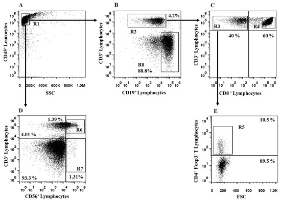 Flow cytometry gating strategy for analysis of CLL subjects with stable disease. Panel (A) shows the R1 gating on circulating CD45+ cells of the CLL subjects. From R1 region, we identified CD3+ T cells (R2, Panel (B)). From R2, we gated the CD3+ CD8- (R3, Panel (C)) and CD3+ CD8+ T cells (R4, Panel (C)). From R3 region, we observed CD4+ Foxp3+ Treg (R5, Panel (E)). From R1 region (Panel (A)), we identified CD3+ CD56+ TR3-56 cells (R6, Panel (D)) and CD3- CD56+ NK lymphocytes (R7, Panel (D)). From R1 gate, the B cells were identified by the CD19 expression (R8, Panel (B)). The figure reports one representative experiment performed in CCL subjects.