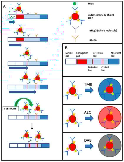 Schematic of the LFIA for human IgG detection. (A) Procedure of the assay. (B) Different parts of an LFIA strip and cartoons representing the gold nanoparticles (AuNPs) modified with an anti-human IgG γ chain-specific horseradish peroxidase (HRP)-modified antibody, with different colors expected for the different substrates (3,3′,5,5′-tetramethylbenzidine [TMB], 3-amino-9-ethylcarbazole [AEC], and 3,3′-diaminobenzidine-tetrahydrochloride [DAB]) used [17].