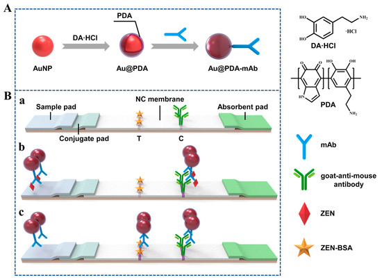 Principle of Au@PDA–LFIA. (A) Preparation of Au@PDA–mAbs. (B) Schematic illustration of ZEN detection using Au@PDA–LFIA: (a) composition of the test strip, (b) detection mode in the presence of ZEN, and (c) detection mode in the absence of ZEN. In this figure, T and C indicate test line and control line, respectively [33].