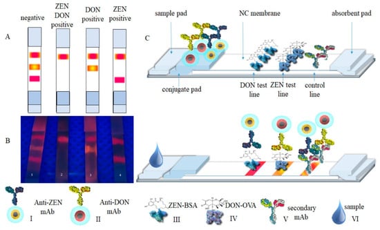 (A,B) Schematic and photograph of dual multicolor deoxynivalenol (DON) and zearalenone (ZEN) detection using LFIA. From left to right: (1) negative for ZEN and DON; (2) positive for ZEN and DON; (3) positive for ZEN and negative for DON; and (4) positive for DON and negative for ZEN. On the bottom: (I) CdSe5.0nm/CdS6ML-SiO2-anti-ZEN mAb conjugate, (II) CdSe3.6nm/CdS6ML-SiO2-anti-DON mAb conjugate, (III) ZEN-BSA conjugate, (IV) DON-OVA conjugate, (V) secondary anti-mouse mAb, and (VI) samples. (C) Schematic illustration of the LFIA test strip [53].