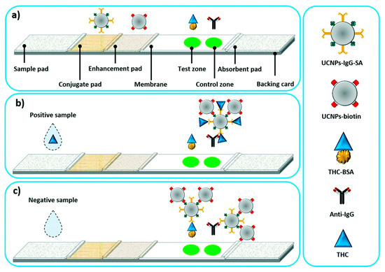 Upconversion of nanoparticle-based LFIA for the detection of tetrahydrocannabinol (THC). (a) Structure of the LFIA strip with the enhancement pad, (b) LFIA in the presence of THC, and (c) LFIA in the absence of THC [64].