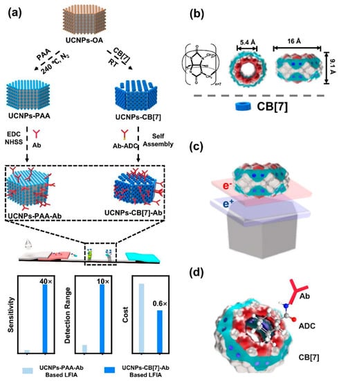 To improve the photoluminescence efficiency of UCNPs used in LFIA, Huang et al. modified the surface of UCNPs using a supramolecular self-assembly strategy (Figure 7) [65]. UCNPs were coated with cucurbit[7]uril (CB[7]) and bound antibodies for target recognition via host–guest interactions between CB[7] and 1-adamantanecarboxyl conjugated with antibodies. The prepared UCNPs showed high PL intensity, stability, and binding affinity for targets such as Escherichia coli O157:h7 or danofloxacin, even though less antibody was consumed during modification. CB[7]-coated UCNPs showed a 40-fold higher sensitivity and a 10-fold higher detection range in LFIA than UCNPs coated with polyacrylic acid.