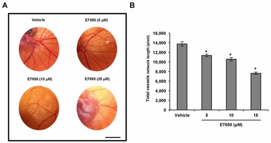 Effect of E7050 on in vivo angiogenesis using the chick embryo CAM assay. (A) Representative images of new blood vessel formation on the in vivo CAM model after exposure to various concentrations of E7050 (5–25 μM) are shown. Scale bar: 1 cm. (B) The bar chart represents the network length of total blood vessels in different treatment groups. The data are presented as mean ± SEM (n = 3 in each group). * p < 0.05 compared with the vehicle-treated cells.