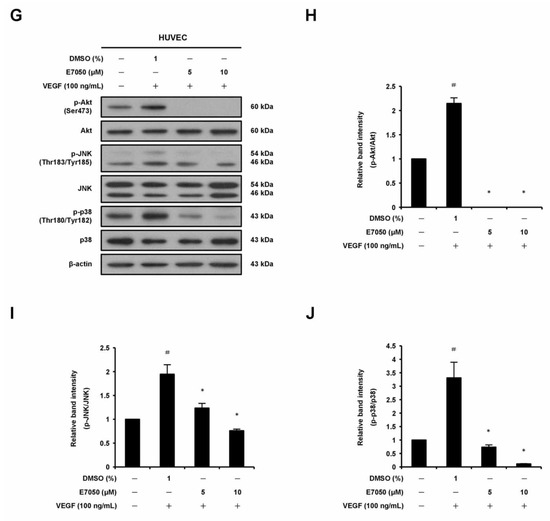 Effects of E7050 on VEGFR2-mediated signaling pathways in VEGF-stimulated HUVECs. Cells were serum-starved for 6 h and then pretreated with E7050 (5 and 10 μM) or vehicle for 1 h, followed by stimulation with VEGF (100 ng/mL) for another 10 min (VEGFR2, PLCγ1, FAK, and Src) or 30 min (Akt, JNK, and p38 MAPK) before proteins were collected. The expression and phosphorylation status of VEGFR2 and its downstream effectors, including PLCγ1, FAK, Src, Akt, JNK, and p38 MAPK, were detected by Western blotting using respective antibodies. (A) E7050 inhibited the phosphorylation (Tyr1175) of VEGFR2 induced by VEGF in HUVECs. (B) The quantified results show that the ratio of p-VEGFR2 protein normalized to the total amount of VEGFR2 protein, which was measured by densitometry. (C) E7050 inhibited the phosphorylation of PLCγ1, FAK, and Src in VEGF-stimulated HUVECs. Calculated ratios of (D) p-PLCγ1, (E) p-FAK, and (F) p-Src normalized to the relative total protein levels are shown. (G) E7050 inhibited the phosphorylation of Akt, JNK, and p38 MAPK in VEGF-stimulated HUVECs. The compiled results of the ratios of (H) p-Akt, (I) p-JNK, and (J) p-p38 MAPK normalized to the relative total protein levels are shown. The data are presented as mean ± SEM of three independent experiments. # p < 0.05 compared with the untreated cells. * p < 0.05 compared with the vehicle-treated cells.