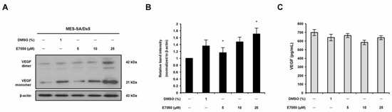 To explore whether the anti-angiogenic effect of E7050 involves the modulation of VEGF expression in multidrug-resistant human uterine sarcoma MES-SA/Dx5 cells, VEGF expression in MES-SA/Dx5 cells in response to E7050 treatment was examined. MES-SA/Dx5 cells were treated with E7050 for 24 h, and VEGF protein levels were determined using Western blotting analysis. As shown in Figure 4A,B, VEGF expression levels in cells treated with E7050 at 5 and 10 μM were similar to those of control cells treated with the DMSO vehicle, whereas E7050 at 25 μM significantly upregulated VEGF protein expression. In contrast, the ELISA data showed that E7050 treatment did not affect the secretion of VEGF in cell culture media (Figure 4C). These results suggest that the anti-angiogenic action of E7050 is not mediated by the inhibition of VEGF production.
