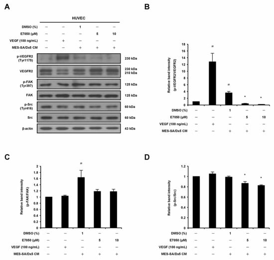 2.5. E7050 Attenuates MES-SA/Dx5 Cells-Derived Conditioned Medium (CM)-Induced Phosphorylation of VEGFR2 and Its Downstream Signaling Mediators in HUVECs