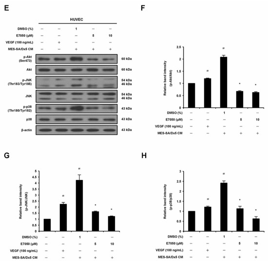 Effects of E7050 on VEGFR2-mediated signaling pathways in cultured MES-SA/Dx5 cells-derived conditioned medium (CM)-treated HUVECs. Cells were serum-starved for 6 h and pretreated with E7050 (5 and 10 μM) or vehicle for 1 h, followed by the addition of VEGF (100 ng/mL) or CM (from cultured MES-SA/Dx5 cells) for another 10 min (VEGFR2, FAK, and Src) or 30 min (Akt, JNK, and p38 MAPK) before protein extraction. The expression and phosphorylation status of VEGFR2 and its downstream effectors, including FAK, Src, Akt, JNK, and p38 MAPK, were detected by Western blotting using specific antibodies. (A) E7050 inhibited the phosphorylation of VEGFR2 and Src in MES-SA/Dx5 CM-induced HUVECs. (B) The relative band density of p-VEGFR2 protein was normalized to total VEGFR2 protein, which was measured by densitometry. Calculated ratios of (C) p-FAK and (D) p-Src normalized to the relative total protein levels are shown. (E) E7050 inhibited the phosphorylation of Akt, JNK, and p38 MAPK in MES-SA/Dx5 CM-induced HUVECs. The compiled results of the ratios of (F) p-Akt, (G) p-JNK, and (H) p-p38 MAPK normalized to relative total protein levels are shown. The data are presented as mean ± SEM of three independent experiments. # p < 0.05 compared with the untreated cells. * p < 0.05 compared with the vehicle-treated cells.