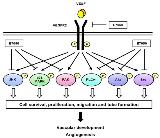 Schematic diagram of a proposed mechanism of E7050-induced anti-angiogenic activity. E7050 exerts anti-angiogenic effects in VEGF-stimulated endothelial cells by downregulating the phosphorylation of VEGFR2 and its downstream mediators, including PLCγ1, FAK, Src, Akt, JNK, and p38 MAPK. The blockage of VEGFR2-mediated signaling cascade pathways by E7050 contributes to the inhibition of proliferation, migration, and tube formation in endothelial cells.