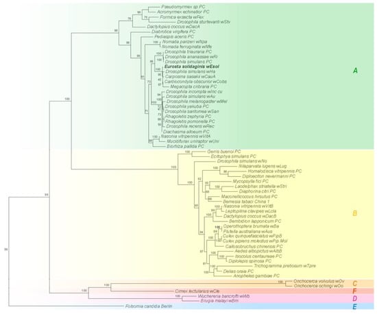 Our phylogenetic analysis placed wEsol centrally within Supergroup A strains of W. pipientis. wEsol was placed in a clade, which is also supported by the phylogenetic analysis of over 1000 Wolbachia strains performed by [74], with strains from distantly related host species (Drosophila simulans wHa, Carposina sasakii, Megacopta cribaria, and Cardiocondyla obscurior). wEsol was not grouped with other Wolbachia strains associated with species in the Tephritidae. This pattern of related Wolbachia strains not occurring on related hosts is common throughout Supergroups A and B and is illustrated by the crossing lines linking hosts to Wolbachia strains in the tanglegram (Figure 2). Furthermore, this pattern suggests that Wolbachia strains are not strictly co-radiating with their insect hosts, which is similar to conclusions reached in other studies and suggests that Wolbachia strains can be readily transmitted horizontally between hosts [74,75,76,77,78].