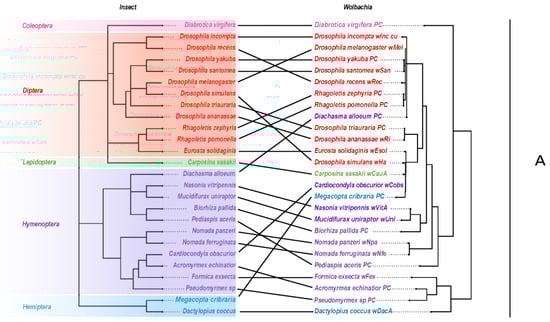We used the phylogenetic information contained in the Open Tree of Life project (OTL) to produce a cladogram for the insect taxa in our sample that host the Supergroup A strains of Wolbachia [131,132,133]. We used the R packages ape and rotl to extract the phylogenetic information and produce an ultrametric, Newick tree [65,67]. To compare the phylogeny of the Wolbachia strains to their insect hosts, we generated a tanglegram using the function “cophylo” from the R package phytools [134].