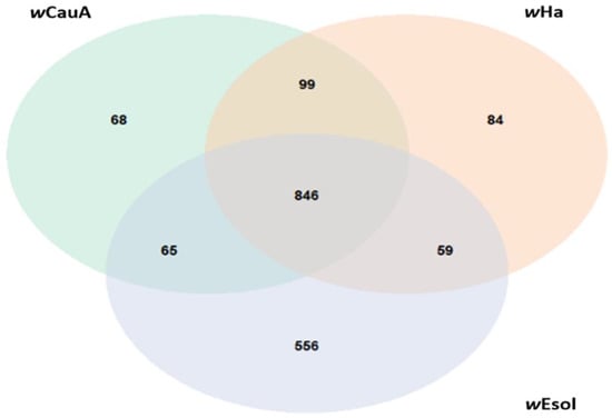 Venn diagram showing the size of the unique and shared components of the proteomes of wEsol from E. solidaginis and its two closest relatives, wCauA from Carposina sasakii and wHa from Drosophila simulans.