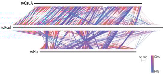 To compare the synteny of the wEsol genome to that of wCauA and wHa, we used Easyfig to visualize the similarity in nucleotide composition of these three genomes [137]. The assembly of the wEsol genome is fragmented into multiple contigs; however, the assemblies of both wCauA and wHa are represented by a single chromosome. We arbitrarily ordered the contigs of wEsol to be as similar in order to the wCauA genome as possible. BLASTn alignments of both wCauA and wHa to wEsol were then visualized. Although the visualization depicts regions of direct and inverted matches, because of the fragmented nature of the wEsol genome, regions of similarity can only indicate matches, not their orientation as direct or inverted matches.
