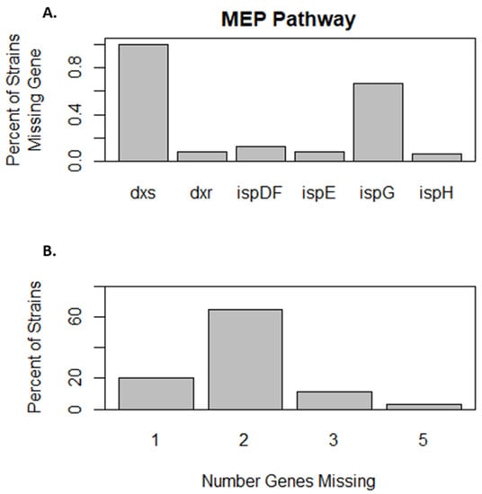 The MEP pathway in Wolbachia. (A) Enzymes missing from the MEP pathway for DMAPP and HBMPP synthesis in 63 Wolbachia strains. (B) Extent of enzymatic loss in 63 Wolbachia strains.
