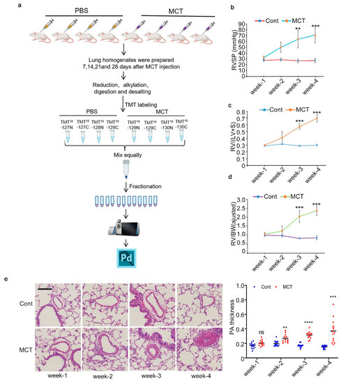 Study design and hemodynamic analysis of MCT-induced PAH rats. (a) Experimental design and workflow for TMT-based quantitative proteomic analysis of lung tissues from rats treated with MCT. (b) Right ventricular systolic pressure (RVSP) of rats treated with MCT or vehicle control (Cont) for the indicated weeks. (c) Changes in Fulton index, which is equal to right ventricle/(left ventricle + septum). (d) Line chart showing the changes in RV/body weight. (e) Representative HE staining images of lung sections from rats treated with MCT or vehicle control and the statistical results of pulmonary arterial wall thickness. Scale bar = 100 μm. For (a–e), results represent mean ± SD, ns means not significant, ** p < 0.01, *** p < 0.001, **** p < 0.0001, unpaired Student’s t-test.