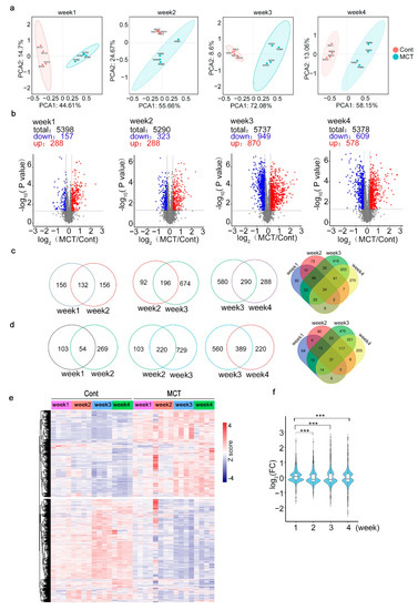 Proteomic profiling of the MCT-treated rats lung tissues. (a) Principal component analysis (PCA) of scaled protein abundances for all biological replicates of control (Cont) and MCT-treated samples. (b) Volcano plots showing the changes in proteins in Cont and MCT samples of each group. (c,d) Venn diagrams showing the numbers of proteins significantly upregulated (c) or downregulated (d) in MCT samples compared to control samples. (e) Heatmap showing the protein abundances of all samples. Proteins changed (p-value < 0.05, fold change < 0.83 or >1.2) in at least one group of data were included. (f) Violin plots showing the log2-transformed fold changes of protein abundance of MCT to Cont for each group. *** p < 0.001.