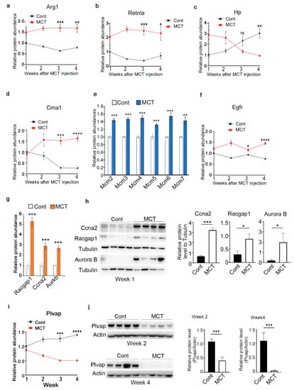 Verification of representative proteins identified in proteomic analysis of the lung tissue. (a–d,f,i) Relative abundance of the indicated proteins identified by proteomic analysis in lung tissues from rats treated with MCT or PBS (Cont). (e,g) Relative abundances of the indicated proteins upregulated in samples from rats treated with MCT for one week. (h,j) Western blot (WB) analysis and quantification of the indicated proteins in lung tissues of rats treated with MCT or PBS. Data represent mean ± SD; ns means not significant, * p < 0.05, ** p < 0.01, *** p < 0.001, **** p < 0.0001, n = 4.