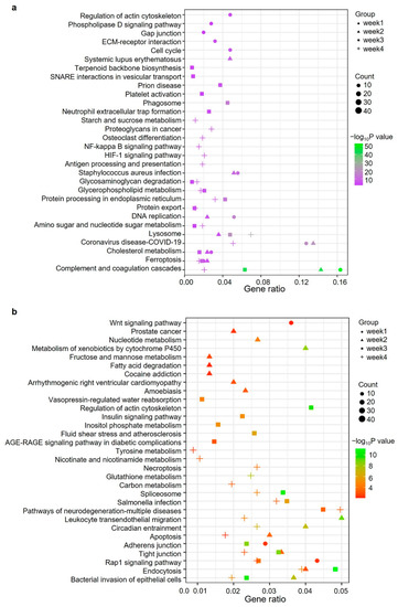 To understand which biological processes or pathways were affected during the progression of PAH, we performed GO and KEGG pathway analysis for proteins differently expressed between control and MCT samples. Proteins with FC > 1.2 or FC < 0.83 in each group were involved in the analysis. For upregulated proteins, adaptive immune response was the only biological process shared by all four groups of samples. Negative regulation of proteolysis and humoral immune response were two terms enriched in weeks 1, 3 and 4 (Supplementary Figure S6). For downregulated proteins, no GO term was enriched in all four groups, while cell–cell junction organization and cellular modified amino acid metabolic process were two terms enriched in three groups of samples (Supplementary Figure S7). KEGG pathway analysis of the upregulated proteins revealed that complement and coagulation cascades, ferroptosis, coronavirus disease (COVID-19) and lysosome were the terms enriched in at least three groups of data (Figure 4a). Notably, the involvement of complement and coagulation cascades in PAH has also been revealed in recent studies from other groups [12,23]. Moreover, there were also several pathway terms enriched in two groups, such as DNA replication, amino sugar and nucleotide sugar metabolism and glycerophospholipid metabolism (Figure 4a). Multiple pathways were enriched in at least two groups of data for downregulated proteins, such as apoptosis, endocytosis, bacterial invasion of epithelial cells, tight junction and Rap1 signaling pathway (Figure 4b).