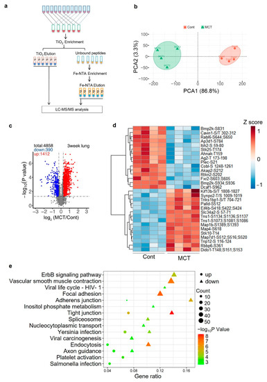 Phosphoproteomic profiling of lung tissues from MCT-induced PAH model rats. (a) Workflow for phosphopeptides enrichment for lung tissues. (b) PCA analysis for phosphopeptides’ abundances for all biological replicates of control (Cont) and MCT treated samples. (c) Volcano plots showing the changes in phosphopeptides in lung tissue of Cont and MCT rats. (d) Heatmap showing the top-15 downregulated phosphopeptides (FC < 0.83, p-value < 0.05) and upregulated phosphopeptides (FC > 1.2, p-value < 0.05). (e) Pathway enrichment analysis for significantly changed phosphoproteins in lung tissues from rats treated with MCT or vehicle control for three weeks.