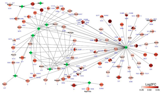 Finally, we integratively analyzed the proteomic data and phosophoproteomic data of the lung samples from rats treated with MCT for three weeks. PPI functional networks were created with significantly upregulated kinase proteins from proteomic data and upregulated phosphoproteins from phosophoproteomic data (Figure 6). In this network, phosphoproteins interacting with a certain kinase could be regarded as the potential substrates and their changed phosphorylation was likely to be caused by changes in the level of the corresponding kinase. In the upregulated group of the lung, epidermal growth factor receptor (Egfr), tyrosine–protein kinase (Btk) and serine/threonine–protein kinase (Plk2) were three representative kinases interacting with multiple phosphorylated proteins, such as mTor, Stat3, Tensin-1 (Tns1) and Stim2 (Figure 6). Of note, a recent paper also found increased Btk in lung tissues of MCT-induced PAH rats and inhibition of Btk attenuated MCT-induced PAH [24].