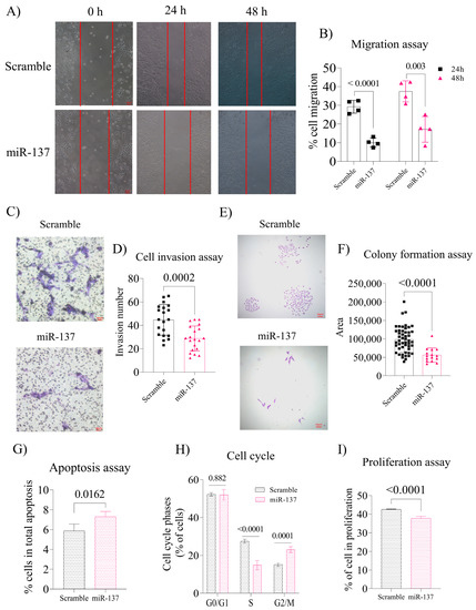 Overexpression of miR-137 negatively impacted cell migration potential after 24 and 48 h (p < 0.0001 and p = 0.003, respectively, Figure 2A,B). The same result was observed in cell invasion ability (p = 0.0002, Figure 2C,D) and colony formation ability (p < 0.0001, Figure 2E,F). Additionally, it was determined that upregulated miR-137 expression triggers increased apoptosis (p = 0.016, Figure 2G) and the number of cells arrested in the G0/G1 phase (p = 0.882, Figure 2H), although this result was not statistically significant. However, increased levels of this miR decreased the number of S phase cells (p < 0.0001, Figure 2H). The percentage of cells in the G2/M and S phases of the cell cycle indicated that the cell proliferation rate of miR-137-treated cells was significantly reduced compared to control cells (p < 0.0001, Figure 2I).