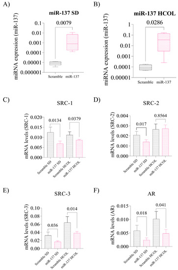 Expression levels of miR-137 and its target mRNAs from the post-treatment tumor xenografts. (A) Expression levels of miR-137 in the SD group; Mann–Whitney test. (B) Expression levels of miR-137 in the HCOL group; Mann–Whitney test. (C) Expression levels of SRC-1 mRNA in the SD and HCOL groups post miR-137 treatment; Student’s t-test. (D) SRC-2 mRNA expression levels in the SD and HCOL groups post miR-137 treatment; Student’s t-test. (E) SRC-3 mRNA expression levels in the SD and HCOL groups post miR-137 treatment; Student’s t-test. (F) AR mRNA expression levels in the SD and HCOL groups post miR-137 treatment; Student’s t-test. Statistical analyses for p160 and AR genes were performed individually, with their control and miR within their data group, SD (Scramble x miR—bars on the left) and HCOL (Scramble x miR—bars on the right). The p-values obtained from the statistical analyses are shown above the bars in each panel. The error bars correspond to the standard deviation of the samples.
