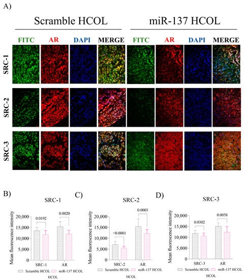In vivo effect of miR-137 and cholesterol restoration on p160 and AR protein expression, HCOL group. (A) Representation of IF in tissues immunolabeled with anti-SRC-1, SRC-2, SRC-3, and AR treated with miR-137 and their respective control (Magnification 400×). (B) Fluorescence intensity levels of SRC-1 and AR. (C) Fluorescence intensity levels of SRC-2 and RA. (D) Fluorescence intensity levels of SRC-3 and RA; Mann–Whitney test. Student’s t-test was used in all analyses except AR/SRC-3. The p-values obtained from the statistical analyses are shown above the bars in each panel. The error bars correspond to the standard deviation of the samples.