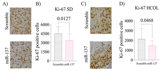 Tissue proliferation index by Ki-67. Cell proliferation levels were measured by Ki-67 immunohistochemistry reaction (Clone Mib-1). (A) Representative images of the SD group after being treated with miR-137 and control (Magnification 200×). (B) Statistical analysis of tissue proliferation in the SD group. (C) Representative images of the HCOL group after being treated with miR-137 and control (Magnification 200×). (D) Statistical analysis of tissue proliferation in the HCOL group. Student’s t-test was used for all analyses. The p-values obtained from the statistical analyses are shown above the bars in each panel. The error bars correspond to the standard deviation of the samples.