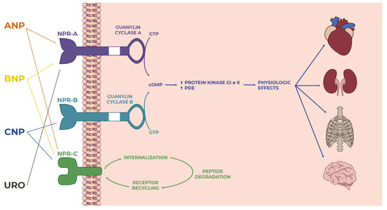 - Potter, L.R.; Yoder, A.R.; Flora, D.R.; Antos, L.K.; Dickey, D.M. Natriuretic peptides: Their structures, receptors, physiologic functions and therapeutic applications. In Handbook of Experimental Pharmacology; Schmidt, H.H.H.W., Hofmann, F., Stasch, J.-P., Eds.; Springer: Berlin/Heidelberg, Germany, 2009; Volume 191, pp. 341–366. ISBN 9783540689607. [Google Scholar]