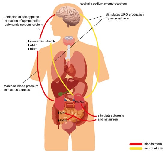 - Emmeluth, C.; Drummer, C.; Gerzer, R.; Bie, P. Roles of cephalic Na+ concentration and urodilatin in control of renal Na+ excretion. Am. J. Physiol. 1992, 262 Pt 2, F513–F516. [Google Scholar] [CrossRef] [PubMed]