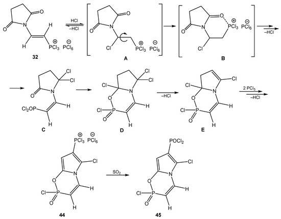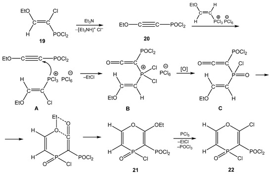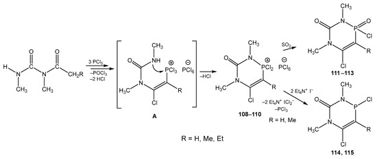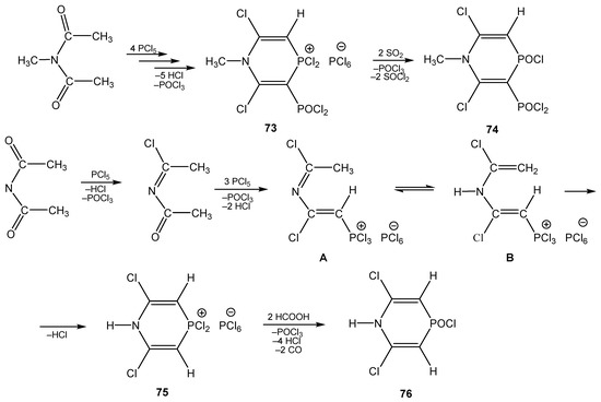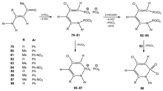 - Rozinov, V.G.; Izhboldina, L.P.; Donskih, V.I.; Kalabina, A.V. Reaction of phosphorus pentachloride with enamides—A new source of 1,4-azaphosphorins. Russ. J. Gen. Chem. 1987, 57, 478–479. [Google Scholar]