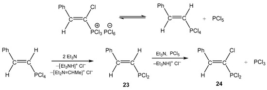 | 23 | ![]() | 7.58 dd, 1H, P–CH= 3JHH = 15.3, 2JPH = 9.2 7.50 m, 5H, Ph 7.30 dd, 1H, Ph–CH= 3JPH = 19.1, 3JHH = 15.3 | 142.2 d, C-P 1JPC = 98.0 112.4 d, C-Ph 2JPC = 35.0 | 162.8 dd PCl2 3JPH = 19.1 2JPH = 9.2 |