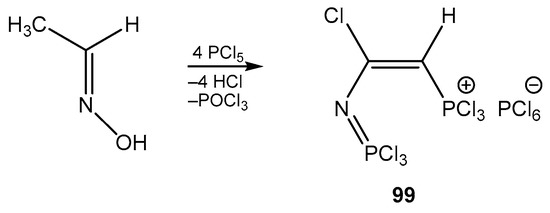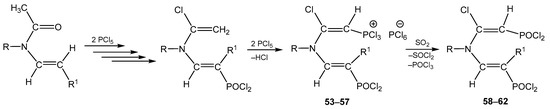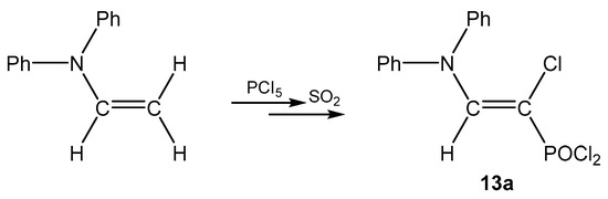 - Rozinov, V.G.; Izhboldina, L.P.; Malysheva, S.F.; Donskikh, V.I.; Kalabina, A.V. Phosphorylation of N-vinylacetanilide with phosphorus pentachloride. Russ. J. Gen. Chem. 1983, 53, 934–935. (In Russian) [Google Scholar]