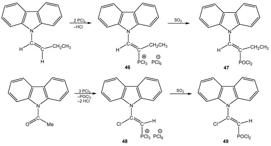- Pensionerova, G.A.; Rozinov, V.G.; Glukhikh, V.I. The phosphorylation of tertiary amines with phosphorus pentachloride. Russ. J. Gen. Chem. 1978, 48, 2796. [Google Scholar]