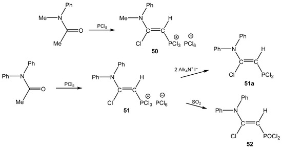 - Pensionerova, G.A.; Rozinov, V.G.; Kalabina, A.V.; Donskih, V.I.; Glukhikh, V.I.; Ratovskiy, G.V.; Dmitrichenko, M.Y. Phosphorylation of N,N-disubstituted amides with phosphorus pentachloride. Russ. J. Gen. Chem. 1982, 52, 2491–2499. [Google Scholar]