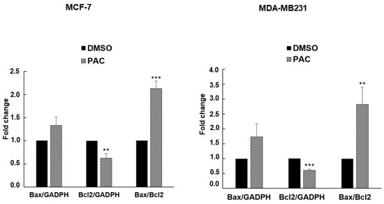 2.5. PAC Induces Apoptosis in MCF-7 and MDA-MB-231 through an Increase in the Bax/Bcl-2 Ratio