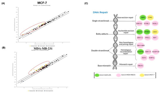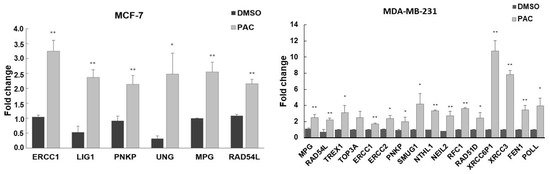 2.6. PAC Modulates the DNA Repair Gene Expression in MCF-7 and MDA-MB-231 Cells