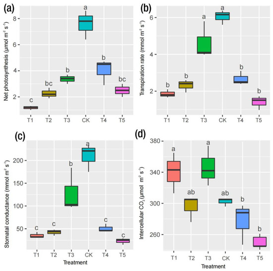As shown in Figure 2a, in the Mg deficiency group, a low or high supply of Mg significantly reduced the Pn of mulberry plants, but an increase an in Pn was observed for the CK treatment group. Similar trends were observed for the Tr and Gs in which CK outperformed the other treatments (Figure 2b,c). The present results suggest that Mg treatment did not severely affect physiological efficiency among the T1, T2, T4 and T5 treatments in mulberry plants. However, CK was lower compared to T1 and T3 in terms of their Ci, with the T5 treatment having the most reduced Ci value. The availability of Mg promotes photosynthetic efficiency, which largely impacts plant biomass production [18]. The positive and highly significant correlation between the gas exchange parameters (Pn, Gs and Tr) and plant biomass (measured in fresh and dry weights) were not coincidental but were rather indicative of a strong relationship between these variables, as demonstrated by their robust correlation coefficients (r = 0.83, 0.74 and 0.76, respectively) (Figure 1e).