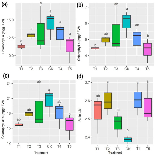 In chlorophyll molecules, Mg occupies the central position of the porphyrin ring and activates or regulates several kinases, such as ATPases and ribulose-1,5-bisphosphate carboxylase/oxygenase (RuBisCO) [21,24,25]. Consequently, Mg deficiency is detrimental to numerous physiological processes such as chlorophyll biosynthesis, plant growth and plant development under Mg stress [25]. Mulberry plants experiencing Mg deficiency and excess Mg suffered marked reductions in photosynthetic pigments (Chl a, Chl b and Chl a+b) (Figure 2). Relative to the control (CK), there were significant reductions in chlorophyll b and a+b in deficient and excess Mg treatments, which could be observed in T1 (27 and 28%) and T5 (23 and 24%), respectively; however, the effect was not pronounced in Chl a (22%). This phenomenon explains the adverse ramifications of Mg deficiency and excess on the chlorophyll pigmentation in mulberry plants. The decrease in photosynthetic pigments could be attributed to the lower levels of Mg in the leaves of Mg-deficient and toxic plants, which could have inhibited the biosynthesis of chlorophyll in mulberry. This development was confirmed by Li et al. (2017), who observed no significant variations in Chl a in the upper leaves of Citrus sinensis supplied with sufficient and deficient Mg conditions compared with the lower leaves [26]. Meanwhile, the responses of Chl a and b to Mg have been found to exhibit differential, non-uniform, cultivar-specific responses and sometimes do not correlate with Mg-induced deficiency [27].