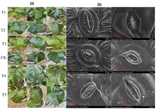 As depicted in Figure 3a, irrespective of the Mg treatment, the Mg supply did not affect the Chl a concentration significantly. However, the reverse was observed for Chl b and Chl a+b (Figure 3b,c). Compared with CK, T1 and T5 decreased remarkably in terms of Chl b, resulting in the leaves showing symptoms of chlorosis and necrotic spots, as observed in T1 and T5 (Figure 4a; T1–T5). When comparing the leaves’ symptoms, however, the plants receiving low supplies of Mg (T2 and T3) showed some signs of leaf chlorosis, but the symptoms were not prevalent, as observed in cases of Mg deficiency and toxicity. In the plants receiving an optimum Mg supply (CK,) the mulberry leaves showed normal growth without any symptoms on the leaves. The summation of Chl a and b (Chl a+b) only demonstrated significant variation when CK was compared with T5, indicating that Mg supplied in excess (toxicity) affected the chlorophyll or leaf pigment when compared to Mg deficiency (T1) (Figure 3c). However, Chl a/b demonstrated a significant increase for all levels of Mg (T1, T2, T4 and T5) except CK, which exhibited the lowest level in this regard (Figure 3d). Interestingly, remarkable correlations were observed between chlorophyll contents, biomass accumulation and gas exchange traits (Figure 1e). For instance, Chl a, b and a+b correlated positively with Ci (r = 0.17, 0.25, 0.20), Tr (r = 0.47, 0.56, 0.50), Gs (r = 0.45, 0.55, 0.48), Pn (r = 0.51, 0.57, 0.53) and biomass (i.e., fresh and dry weights) (r = 0.57, 0.60, 0.59), respectively. However, the ratio of Chl a/b correlated negatively with all physiological parameters (Figure 1e). A field emission scanning electron microscopy analysis was carried out on the mulberry plants leaves to observe their stomatal apertures (Figure 4b). In the CK samples, the mulberry plants’ stomatal apertures opened widely (Figure 4b). We observed that in the Mg deficiency group, the stomatal apertures completely closed as seen in T1 (Figure 4b). However, when the Mg concentration increased gradually from deficiency, the stomatal apertures opened, although the sizes were decreased (T2 and T3). At high Mg concentrations, we observed that the stomatal aperture opened, and the stomatal size was increased in T5 compared to T4 (Figure 4b).