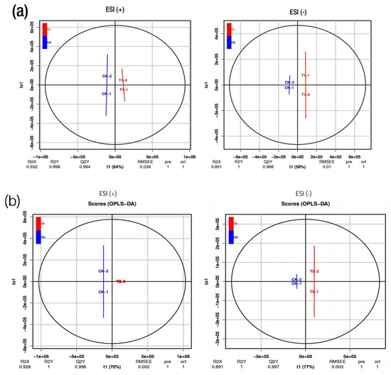 Orthogonal partial least squares discriminant analysis (OPLS-DA) scores of the metabolites (a) CK-T1 (b) CK-T5. The OPLS-DA models are R2X, R2Y and Q2, where R2X and R2Y represent the interpretation rate of the built model to the X and Y matrices, respectively, and Q2 represents the prediction ability of the model. The closer these three indicators are to 1, the more stable and reliable the model is. Q2 > 0.5 indicates that the model has good prediction ability, and Q2 > 0.9 indicates that the model is excellent. ESI (+), positive ion mode; ESI (−), negative ion mode.