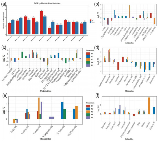 The differential expressed metabolites (DEMs) in CK and the T1–T5 samples from the LC-MS ion modes were screened to analyze the most significant biochemical changes. The DEMs were screened using the VIP (variable importance in projection) values with the criteria VIP ≥ 1 and t-test p < 0.05 in the OPLS-DA model. The results reveal that 379 (37.08%) of the 1022 ESI (+) metabolites, containing 199 up-regulated and 180 down-regulated, were DEMs between CK and T1-T5. In addition, 271 (37.07%) of the 731 metabolites in the ESI (−), including 129 up-regulated and 142 down-regulated, were DEMs in between CK and T1-T5 (Table S2). Furthermore, the DEMs between CK and each group of treatments were analyzed in the ESI (+) and ESI (−). Among them, CK-T1 and CK-T2 revealed a similar trend of DEM expression (Figure 6). In the CK-T1, 61 DEMs (27 up-regulated and 34 down-regulated) and 46 DEMs (16 up-regulated and 30 down-regulated) were in the ESI (+) and ESI (−), respectively (Figure 6a). CK-T2 revealed 72 DEMs (33 up-regulated and 39 down-regulated) in the ESI (+), whereas there were 46 DEMs, 23 up-regulated and 23 down-regulated, in the ESI (−) (Figure 6a). On the other hand, in a comparison of CK-T3, CK-T4, and CK-T5, the DEMs followed a similar expression pattern, with more DEMs expressed in the up-regulated pattern compared to the down-regulated patterns in both the ESI (+) and ESI (−) modes except for CK-T5 in the ESI (−) mode, for which the down-regulated pattern was slightly higher than the up-regulated pattern (Figure 6a). In a comparison of the treatment groups, the DEMs mainly included amino acids and derivatives (15), organic acids (6), secondary metabolites (11), lipids (32), organooxygen compounds, benzene and substituted derivatives; however, the majority of the DEMs were unclassified (Figure 6b–f, Table S2). Volcano plots were employed to show the relationships between the −log10 (p-value) and the fold change (log2(FC)) of all the identified DEMs within the comparison group in order to further understand the up- and downward regulations of the DEMs according to the VIP value and p-value < 0.05 (Figure S5). A cluster heat map analysis of the DEM clearly showed that samples in the same treatment clustered and were clearly distinguished between CK and the other treated groups (T1–T5), as shown in Figure S6. In addition, Figure S7 shows the relative contents of the metabolites in the individual comparisons.