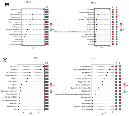 VIP plot of differential metabolites from Mg treatment in mulberry. (a) CK-T1; (b) CK-T5. The abscissa in the figure is the VIP value, the ordinate is the top 15 different metabolites for each group, the color on the right indicates the abundance of this metabolite in different groups, the red color is up-regulated, and the green color is down-regulated. The higher the VIP value, the greater the contribution to the differentiation of the sample, and the metabolites with a default VIP greater than 1 have a significant difference.
