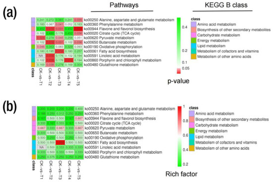 The metabolic pathway analysis indicated that all the 1753 metabolites from the ESI (+) and ESI (−) modes were annotated to 94 KEGG pathways. The annotation was grouped into a KEGG A class, B class, and pathways. The KEGG A class comprises metabolism, genetic information processing and environmental information processing (Figure S11a). In addition, the DEMs in all the treatment group comparisons were annotated to the same KEGG pattern (Figure S11b–f). In the CK-T1 group, the DEMs were annotated to 38 KEGG pathways. However, two pathways related to pyruvate metabolism in the carbohydrate metabolism and oxidative phosphorylation in the energy metabolism (KEGG B class) were significant based on their p-values (<0.05) and biological significance (Table S3). The relative abundances of metabolites such as fumaric acid and succinic acid were up-regulated in these pathways (Figure 8a, Table S3). For CK-T2, the DEMs were annotated to 49 KEGG pathways. Interestingly, five pathways related to linoleic acid metabolism, butanoate metabolism, porphyrin and chlorophyll metabolism, flavone and flavonol biosynthesis and glutathione metabolism were significant (Table S3). In the linoleic acid metabolism, 9-Oxo-ODE and 13-HPODE were down-regulated but 8Z,11Z,14Z-eicosatrienoic acid was up-regulated (Figure 8a). In the butanoate metabolism, L-glutamic acid, succinic acid and D-(+)-malic acid were up-regulated in this pathway (Figure 8a, Table S3). In the porphyrin and chlorophyll metabolism, L-glutamic acid and stercobilin were up- and down-regulated, respectively (Table S3). Kaempferol, quercetin and trifolin in the flavone and flavonol biosynthesis were up-regulated (Figure 8a, Table S3). L-glutamic acid and L-pyroglutamic acid were up- and down-regulated in the glutathione metabolism (Figure 8a, Table S3).